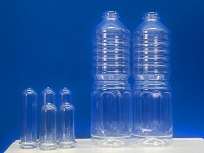 イチビキでは1990年以降30年以上にわたり、自社でペットボトルを生産しています。ペットボトルのもとになるプリフォーム(写真左側)はとてもコンパクトなため、輸送トラックの台数を年間約230台分削減することができ、CO2排出量を抑制してきました。今後もこうした環境負荷の少ないサプライチェーンの実現を通して、Scope3の取り組みに貢献します。