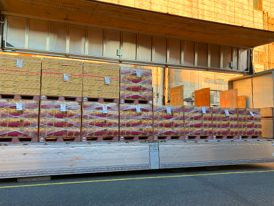 商品設計の段階から輸送効率を考慮してダンボールの強度や積み付け数を決めています。重量の重い商品を下段に、軽い商品を上段に積み、ダンボール、物流会社のご協力も得ながら日々テストを繰り返し、積載数を最適化することで輸送によるガソリン使用量や排出ガスの削減に努めています。この取り組みにより、輸送トラック台数を年間約165台削減しています。