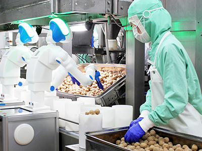 ヒト型の協働ロボット『フードリー』や、コンテナ詰めを行う『ばんじゅうロボット』を導入し、製造工程の自動化を進めてきました。