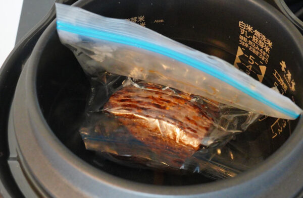 フライパンに油を熱し、牛肉全面に焼き色をつけ、ジッパー付き耐熱袋に入れて密閉する。
