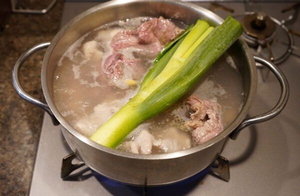 鍋に湯をたっぷりと沸かし、豚モツ、牛スジ、ねぎの青い部分を入れて、アクを取りながら25分ほどゆでる。