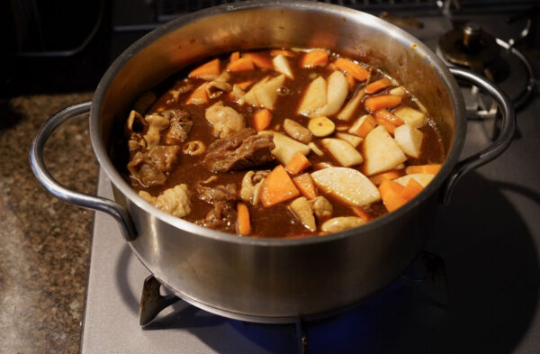 鍋にAを入れて溶かして煮立たせ、(3)と(4)を加えて、アクを取りながら弱火で30分ほど煮込む。