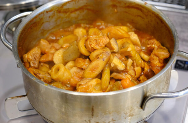 鍋に油を熱し、鶏肉を入れて中火で炒める。表面の色が変わってきたら残りの具材を加え、さらに2分炒める。