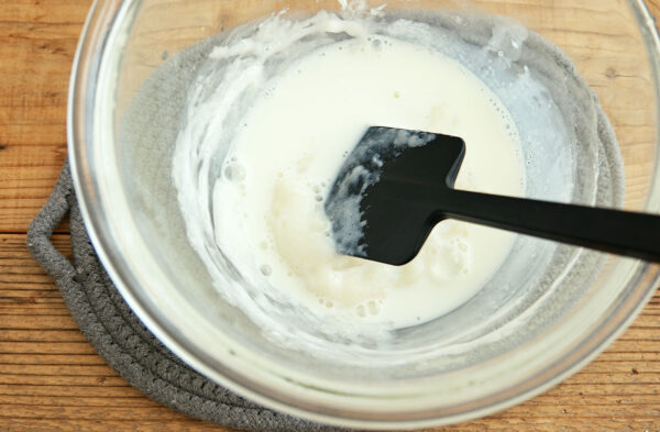 牛乳は2回に分けることで、餅が溶けやすくなり、よく混ざります。加熱時間はご家庭の電子レンジに合わせて調整してください。