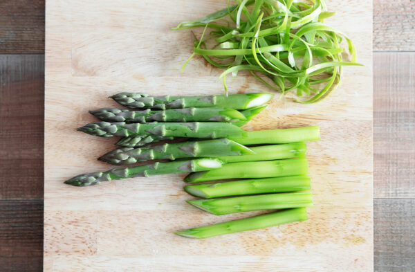 アスパラガスは下側の皮を剥き、斜め半分に切る。