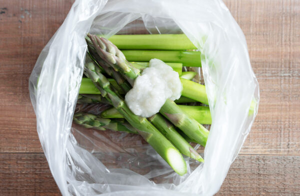 ポリ袋にアスパラガスを入れ、塩糀をなじませる。
