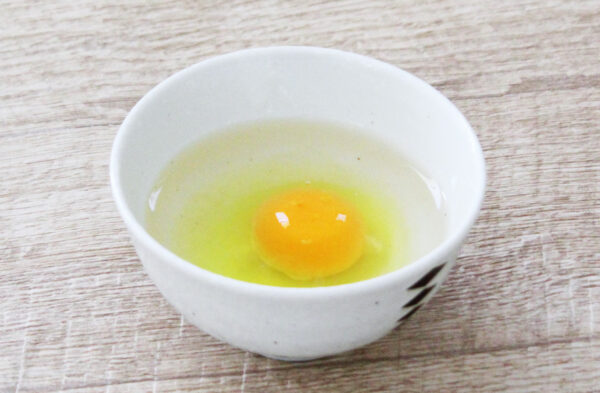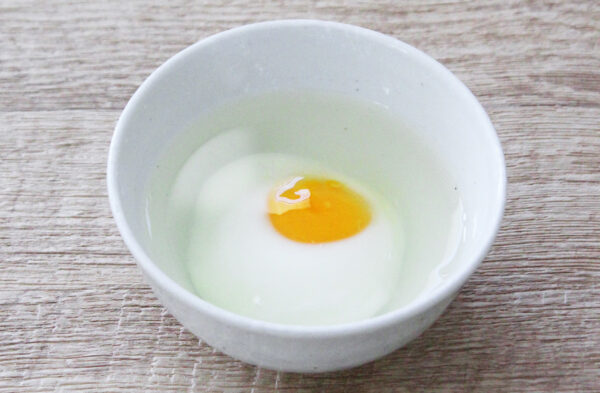 小さめの茶碗に卵を割り入れ、黄身に3カ所穴をあけ、卵がかぶる量の水をそっと注ぐ。