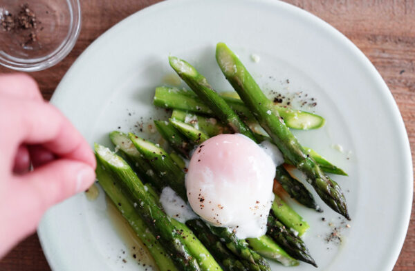 アスパラガスを器に盛りつけて、水気を切った温玉をのせ、ブラックペッパーをトッピングする。