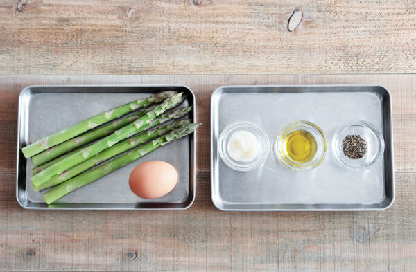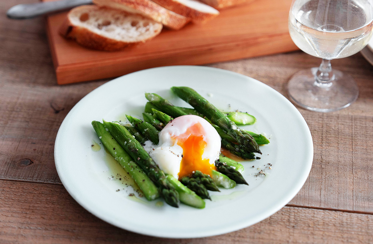 アスパラガスを器に盛りつけて、水気を切った温玉をのせ、ブラックペッパーをトッピングする。