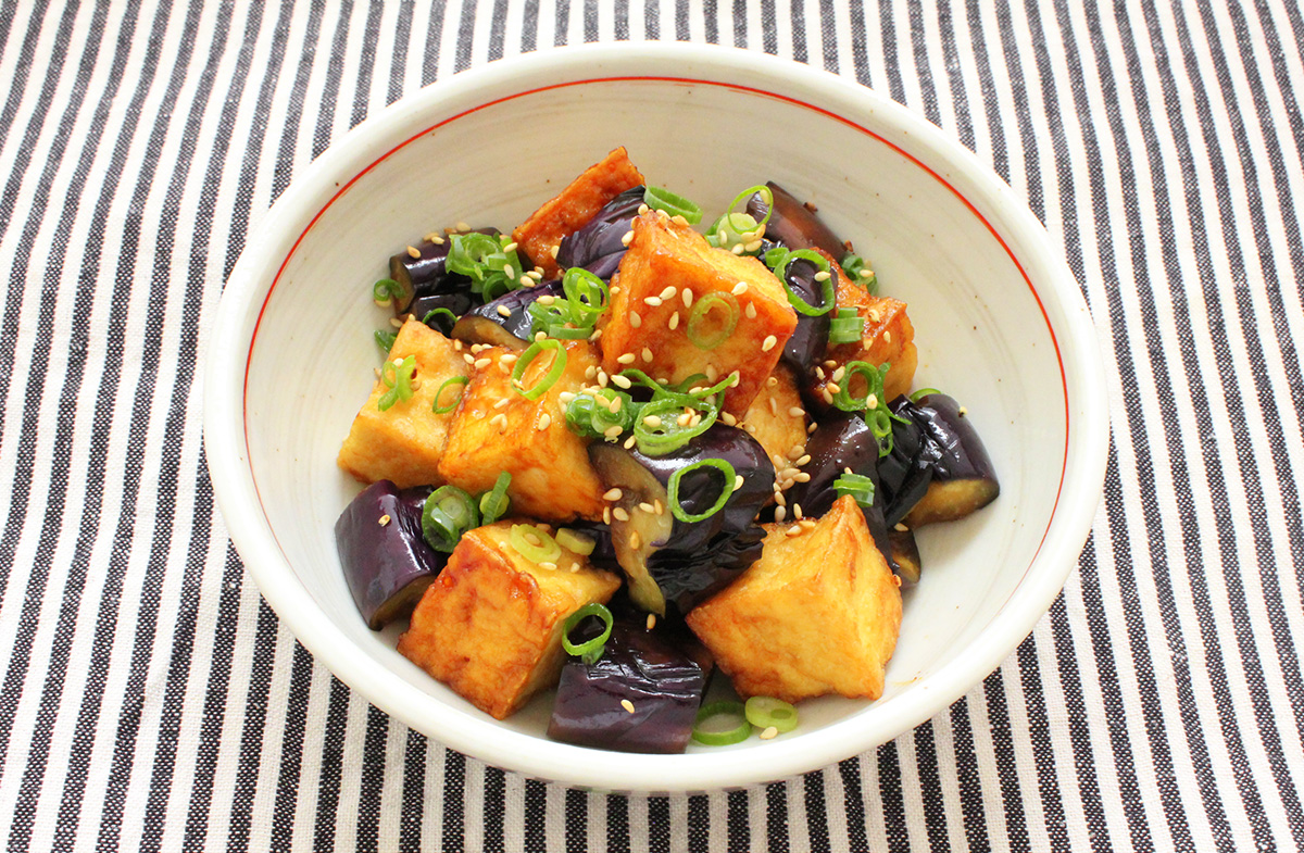なすと厚揚げの甘辛炒め(たまりでつくったあまくちだし醤油使用)