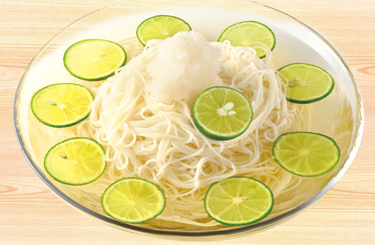 (1)にすだちと大根おろしを盛り付け、「さっぱり和風冷麵つゆ」をかける。