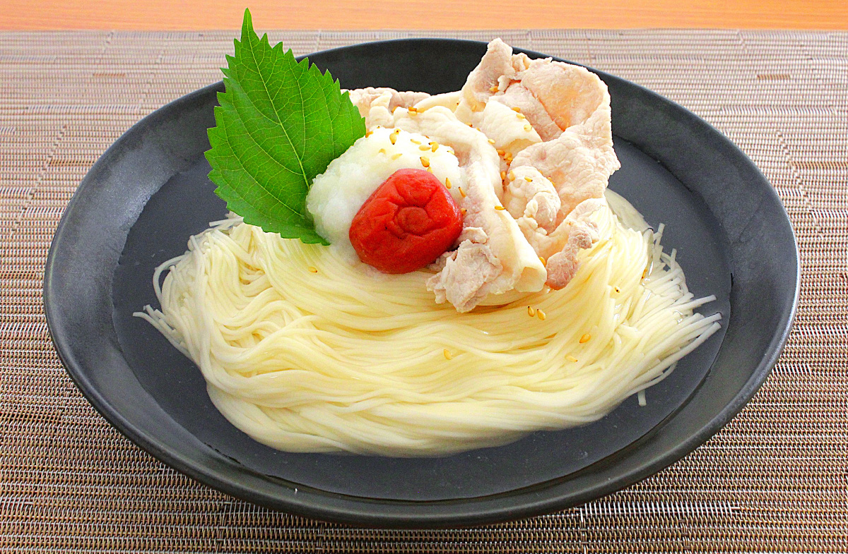 (1)に(2)と大根おろし、大葉、梅干しを盛り付け、「さっぱり和風冷麵つゆ」をかける。