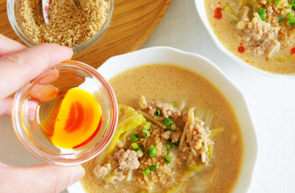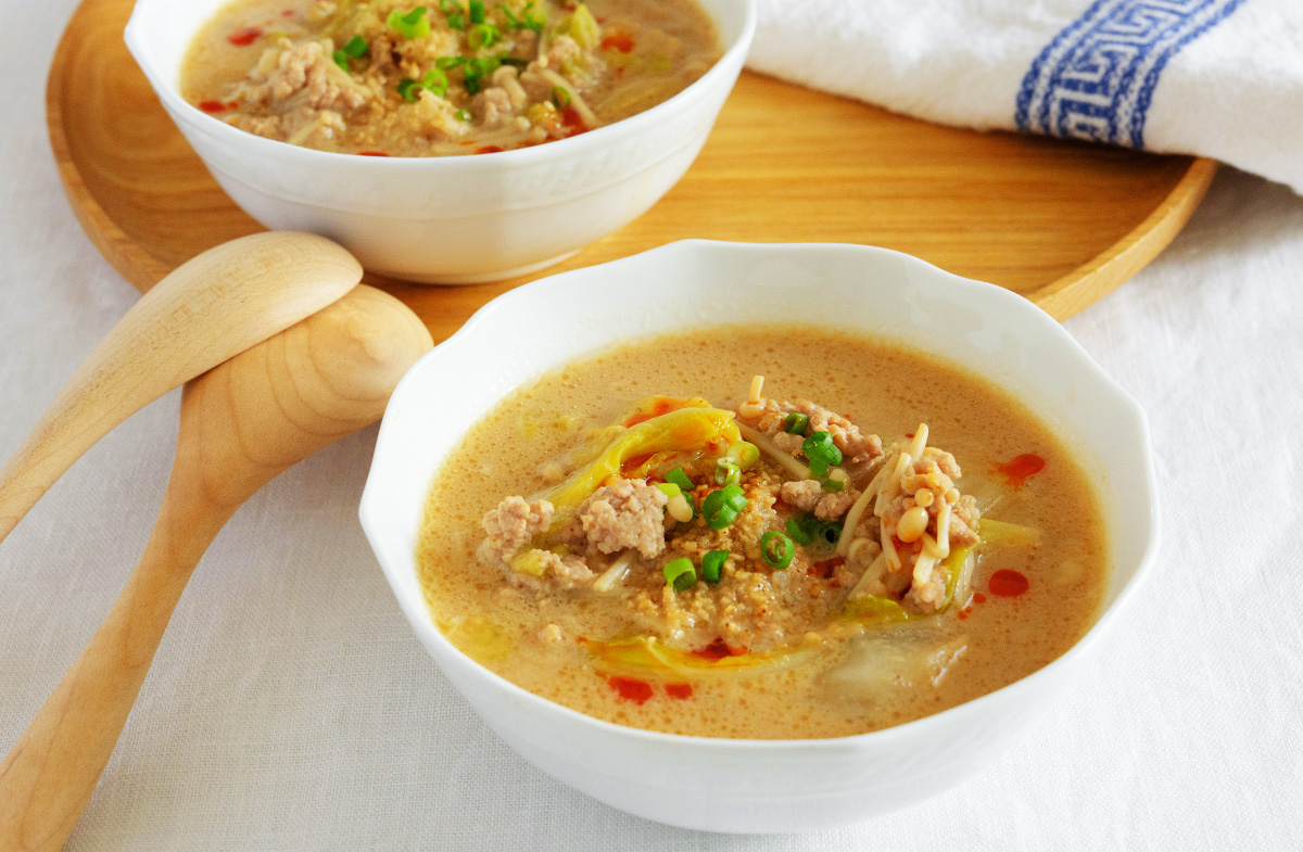 白菜を主役にしたボリューム満点の担々スープ。クリーミーな豆乳と、旨みが詰まった味噌「厳選国産生赤だし」のコクをダイレクトに味わえます。最後にお好みでラー油を加えると、さらに食欲をそそられる味わいになりますよ。