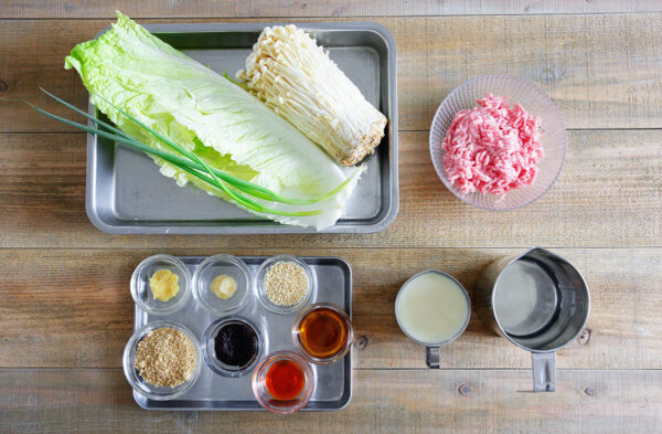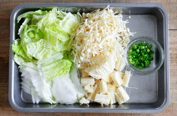白菜は白い部分をそぎ切りにし、葉の部分は食べやすい大きさに切る。えのきは石づきを取って、3cm幅に切る。万能ねぎは小口切りにする。