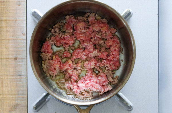鍋にごま油を熱し、豚挽き肉、おろしにんにく、おろししょうがを弱火で炒める。