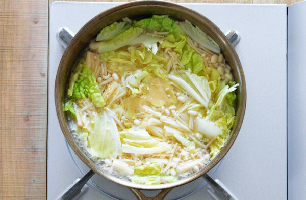 白菜、えのき、水、鶏がらスープの素を加え、白菜が柔らかくなるまで煮る。