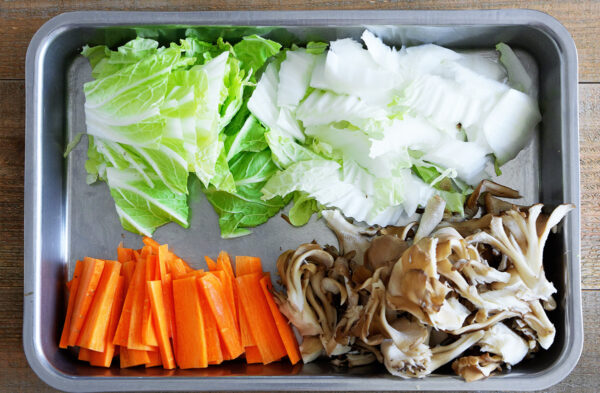 白菜は芯の部分はそぎ切り、葉は食べやすい大きさに切る。にんじんは拍子切りにする。舞茸は手でほぐす。