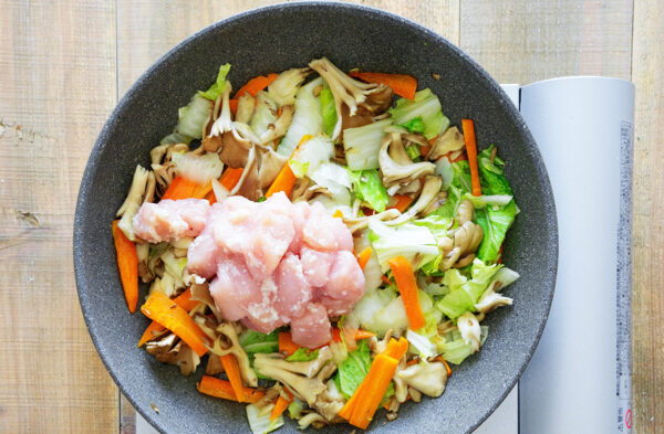 フライパンに油を熱し、にんじん、白菜の芯、舞茸、白菜の葉の順に炒める。しんなりしたら鶏肉を塩糀ごと加えて、さらに炒める。