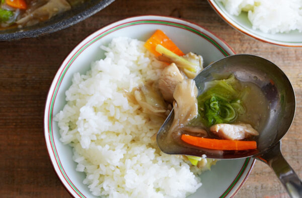 身体の芯から温まるとろ~りあんかけ丼。タンパク質が豊富な鶏ムネ肉と、たっぷりの野菜が入って栄養満点です。