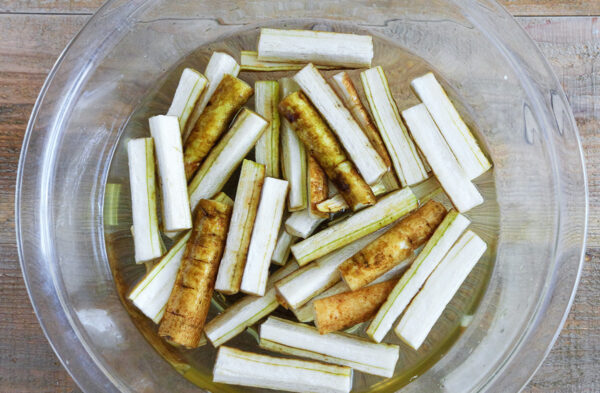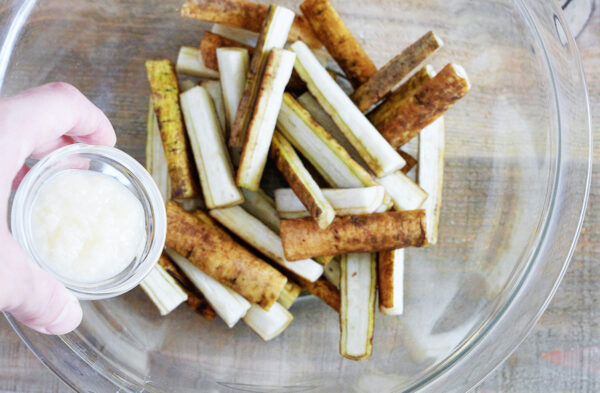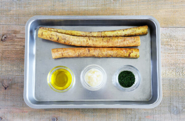 ごぼうの水気をキッチンペーパーで拭き取り、塩糀、オリーブオイルの順に絡める。