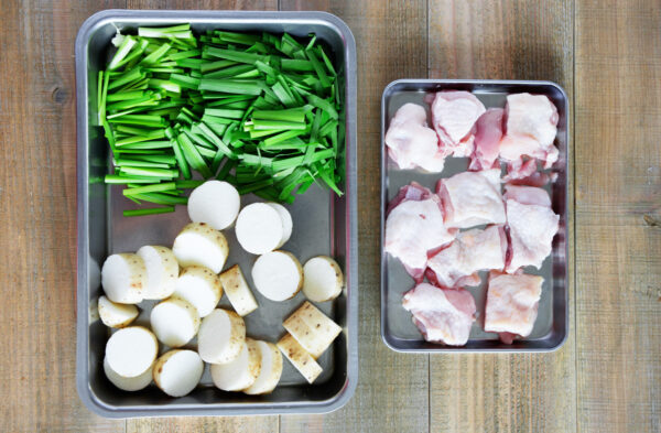 長芋は皮付きのまま輪切りにする。ニラは4cm幅に切る。鶏肉は一口大に切る。