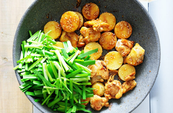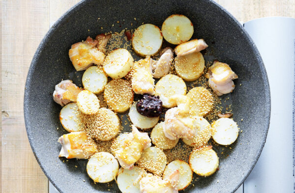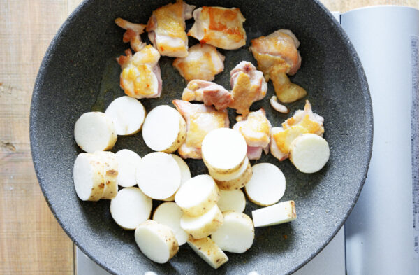 フライパンに油を熱し、鶏肉の皮目から中火で焼く。余分な油をキッチンペーパーで拭き取り、焼き色がついたら裏返す。長芋を加えて中火で炒める。