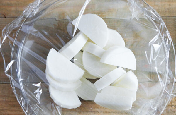大根は皮をむいて、1.5cm幅の半月切りにする。耐熱容器に入れてふんわりとラップをかけ、電子レンジ(600W)で5分加熱する。