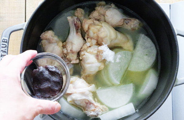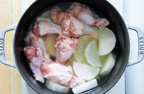 鍋に大根、手羽元、だし汁を加える。フタをして中火にかけ、沸騰したら弱火で5分煮る。