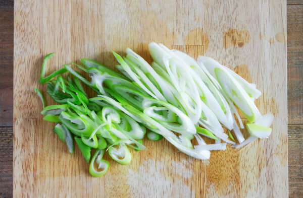 長ねぎは斜め薄切りにする。