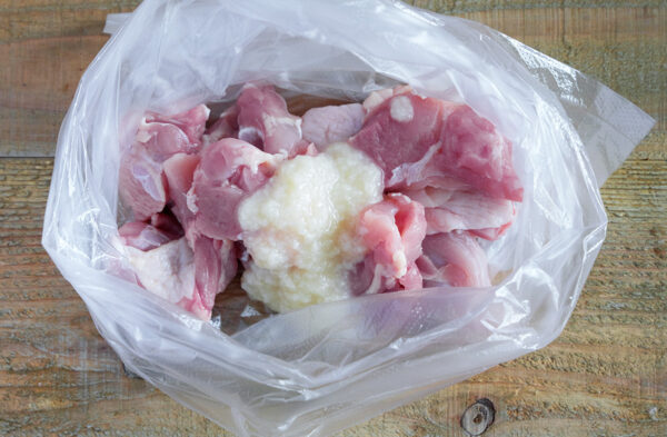 鶏肉をポリ袋に入れて塩糀(大さじ1)をもみ込み、15分おく。