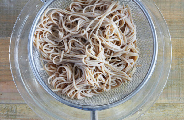そばを袋の表示時間通りに茹で、水で締めてざるにあける。