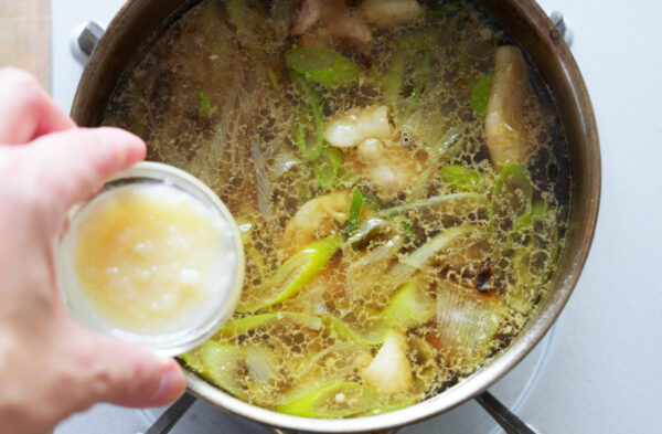 鶏肉の色が変わってきたら、だし汁を加え、ひと煮立ちさせてアクを取る。無添加国産しょうゆ、みりん、塩糀(大さじ1と1/2)を加えて弱火で5分煮る。