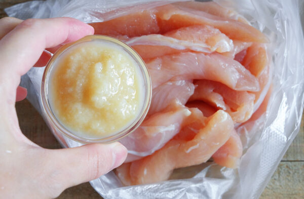 ササミをポリ袋に入れ、塩糀をもみ込んで10分置く。水気を拭き取る。