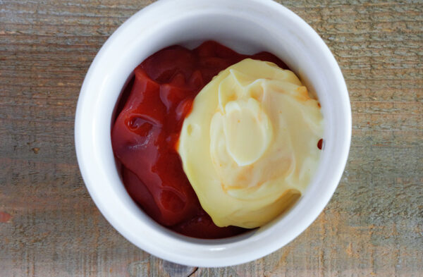 器に盛りつけ、マヨネーズとケチャップを混ぜ合わせたソースをお好みで合わせる。