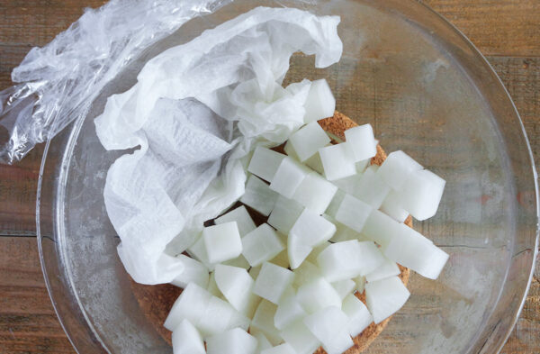 大根を耐熱容器に入れ、濡れたキッチンペーパーをのせる。ふんわりとラップをかけて電子レンジ(600W)で4分加熱する。