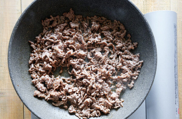 フライパンにごま油を熱し、挽き肉を入れて色が変わるまで中火で炒め、余分な油を拭き取る。