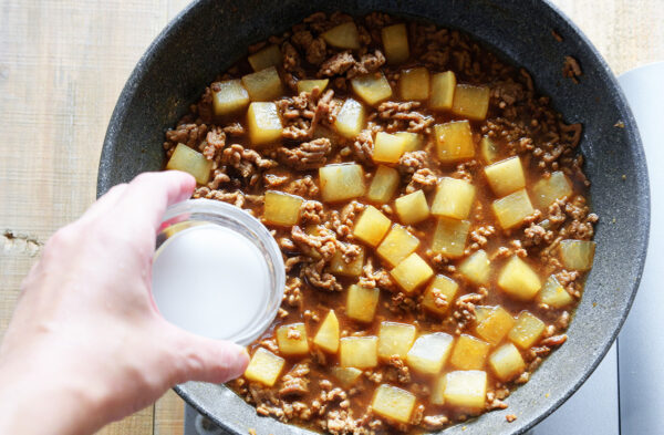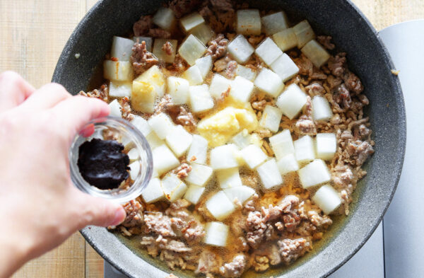 大根を加えて、つやが出るまで中火で炒める。Aを加え、弱火で5分煮る。