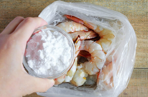 エビをポリ袋に入れ、塩糀をなじませて5分置く。片栗粉(大さじ4)をまぶす。