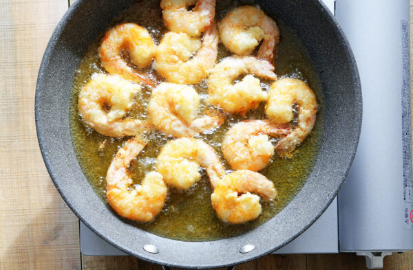 フライパンに深さ1cm程度の油を入れて熱し、エビを揚げ焼きにする。