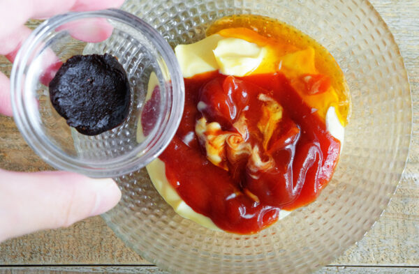 マヨネーズ、ケチャップ、厳選国産生赤だし、はちみつを混ぜ合わせる。