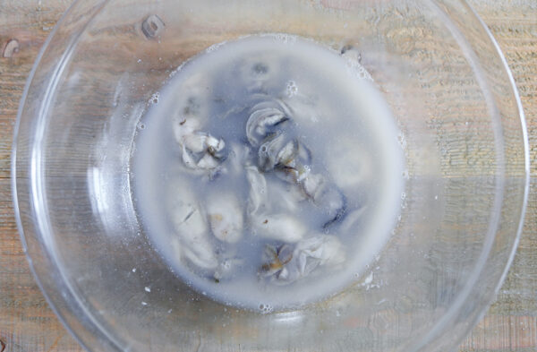 牡蠣に片栗粉をまぶし、やさしく水で洗う。