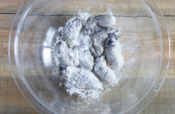 牡蠣の水気を切り、片栗粉をまぶす。