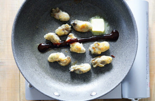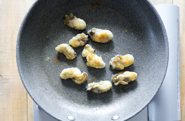 フライパンに油を熱し、牡蠣を入れて焼き色がつくまで焼く。