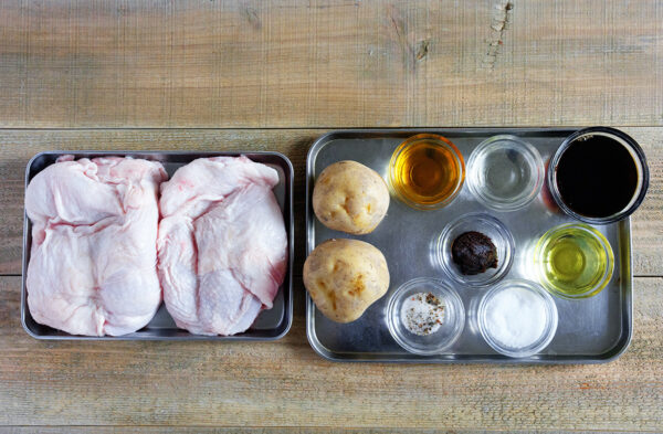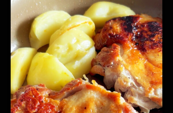 じゃがいもを加えて焼く。火が通ったら、鶏肉とじゃがいもを器に盛りつける。