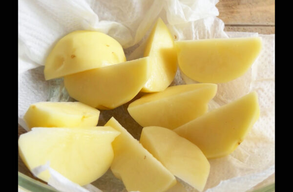 じゃがいもは食べやすい大きさに切る。耐熱容器に入れ、ふんわりとラップをかけて電子レンジ(600W)で4分30秒加熱する。