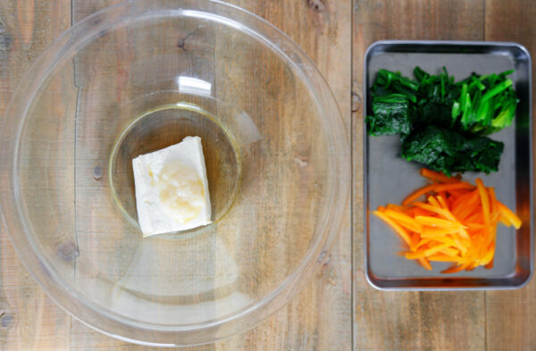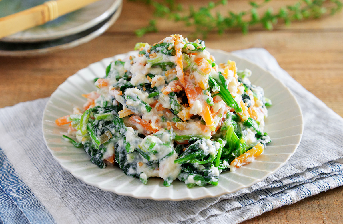 木綿豆腐、塩糀、ごま油を混ぜ合わせ、にんじん、ほうれん草を加えて和える。