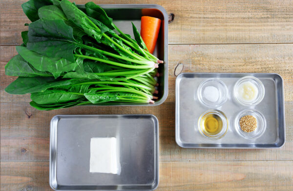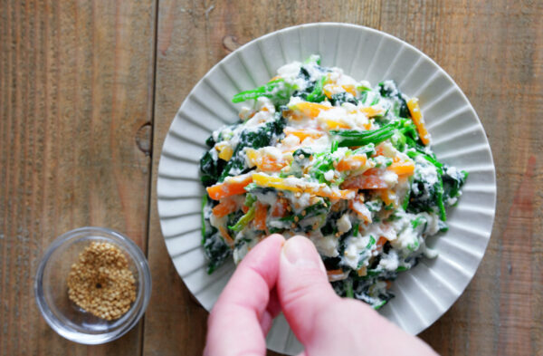素材の美味しさが際立つほうれん草の白和え。塩糀で旨みと甘みをプラスすることで、シンプルな配合でも味がまとまります。