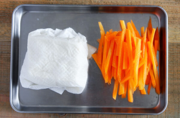 木綿豆腐は水切りのためにキッチンペーパーで二重に包む。にんじんは細切りにする。