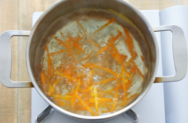 鍋に水(分量外)、塩、にんじんを入れて沸騰させる。3分ゆでてざるにあける。