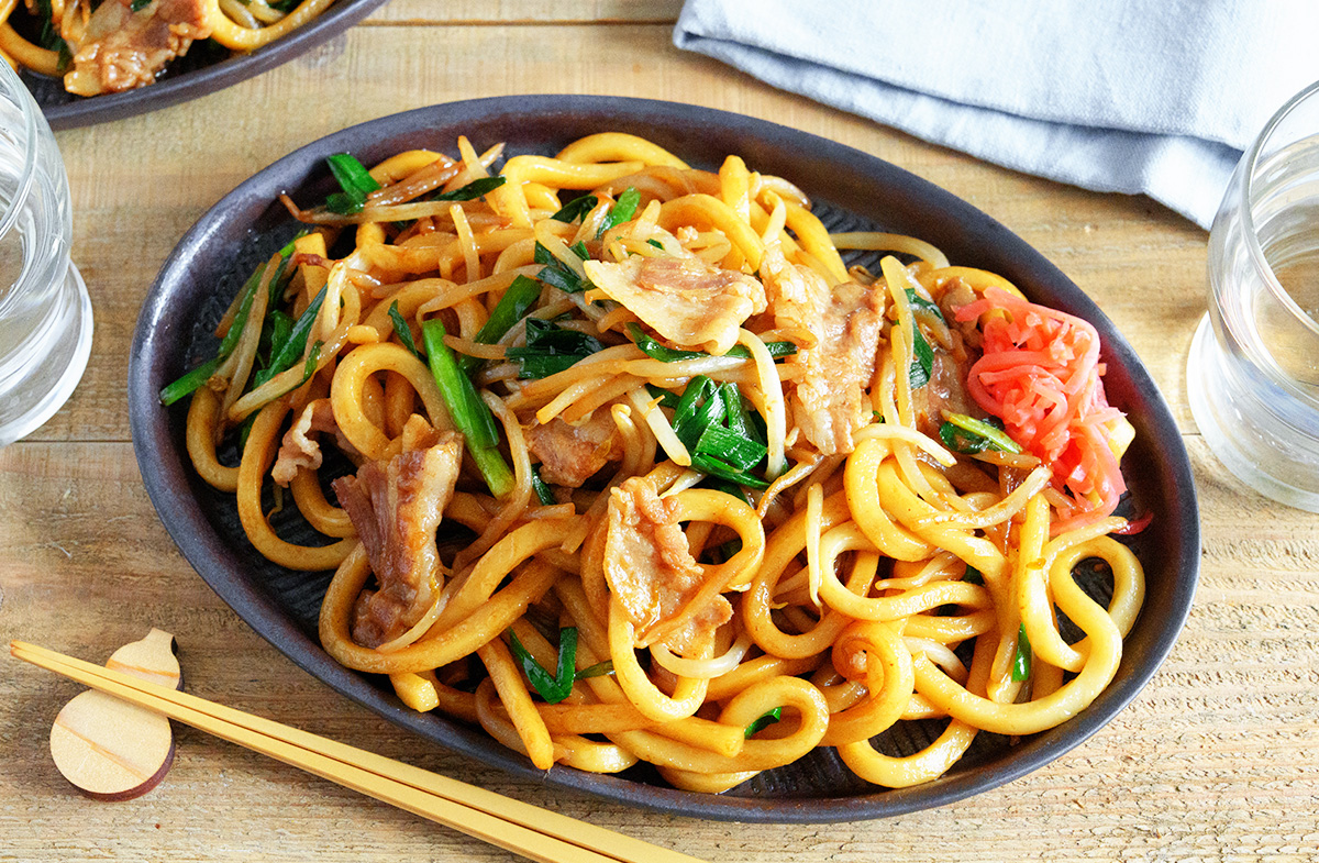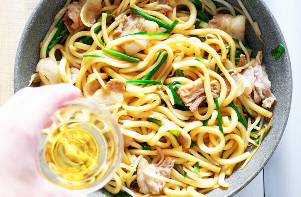 うどんを加えて汁気がなくなるまで炒める。ごま油(大さじ1/2)を加えて絡める。